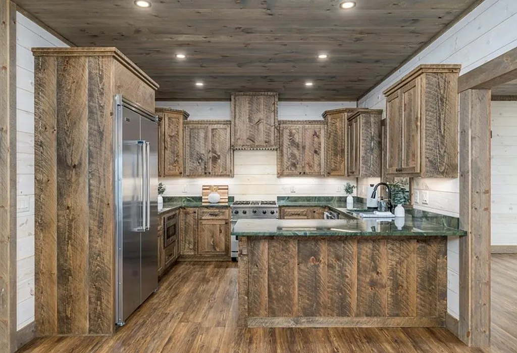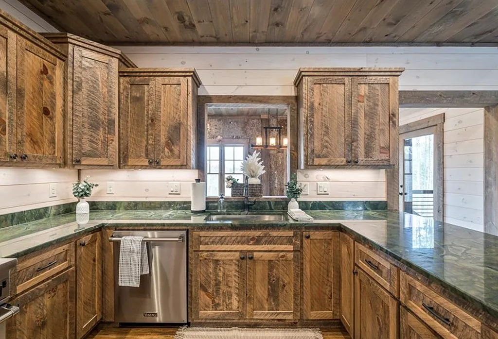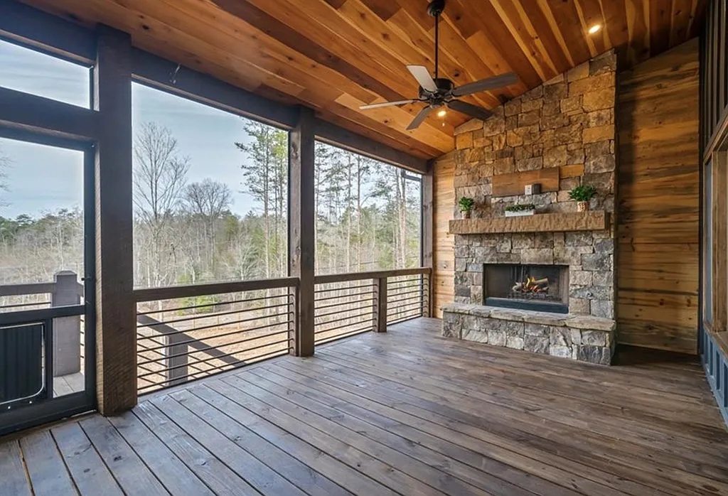 Inside, warm pine walls, hardwood floors, and expansive windows frame sweeping views throughout the main living areas. The open-concept great room is anchored by a striking stone fireplace, creating a welcoming focal point for everyday living and entertaining. The chef’s kitchen features high-end Viking appliances, granite countertops, and a six-burner range, with a serving window that opens to the spacious dining area. Just off the dining space, a screened-in porch with a second stone fireplace provides a peaceful place to enjoy the mountain setting year-round.